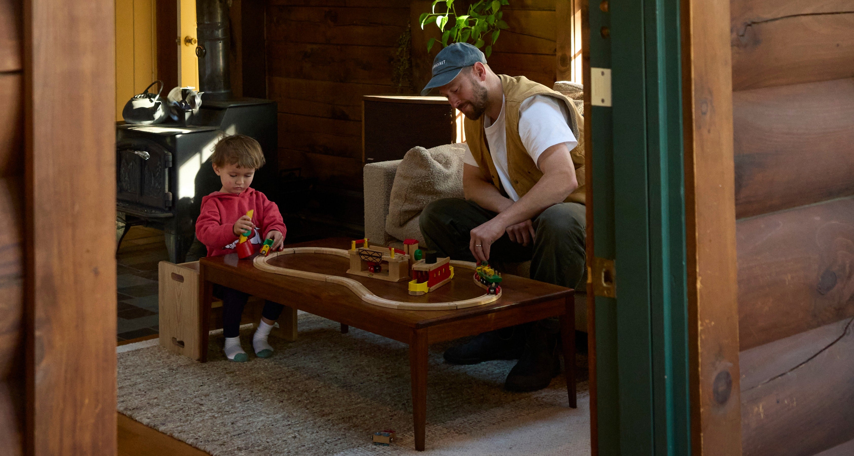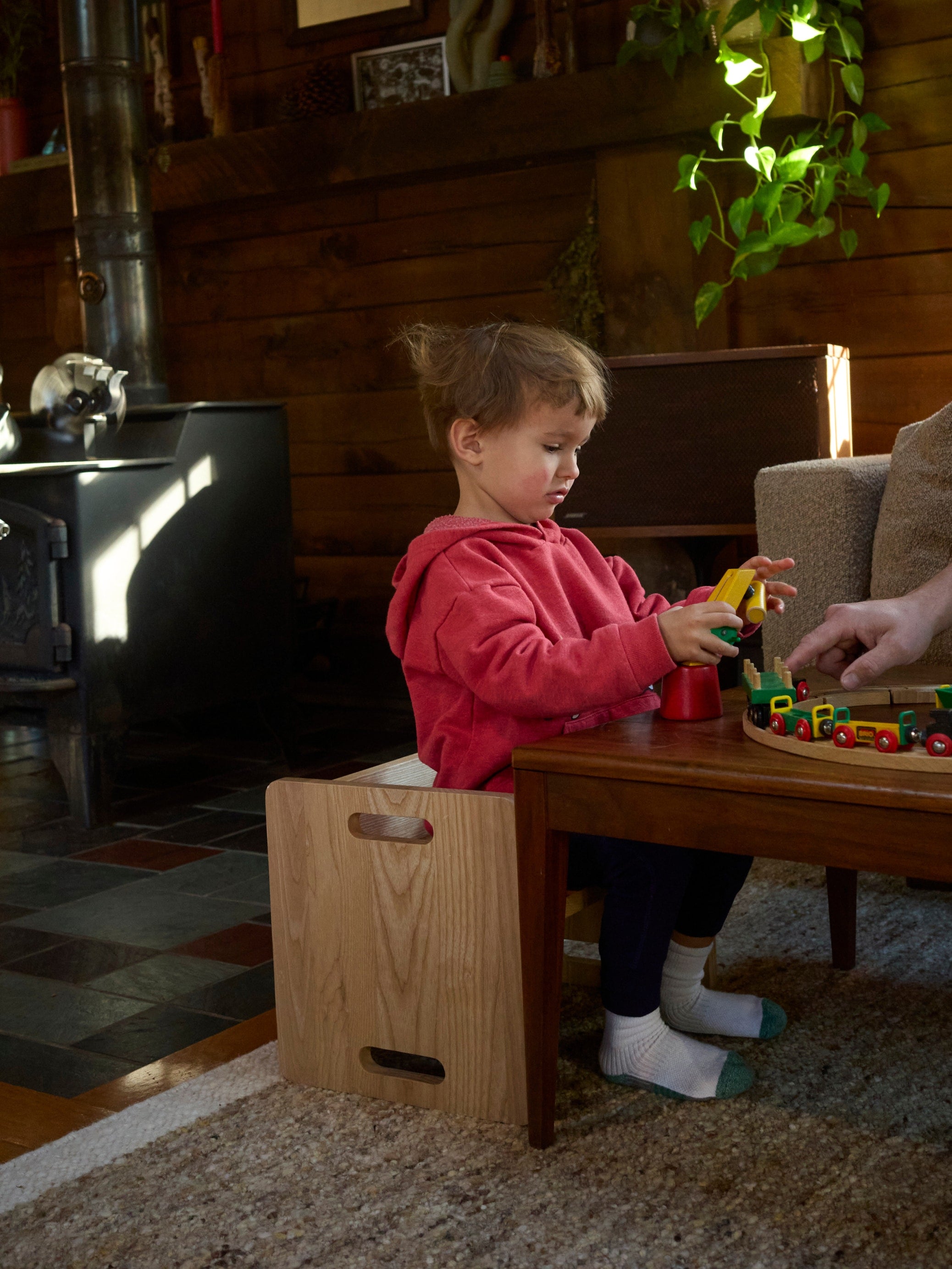 Their cabin-like home is heavy on the wood—but she finds ways to bring colour in. “I contrast with bright candlesticks, pottery with a story behind it, books with interesting covers, and whatever is still green from our garden.”